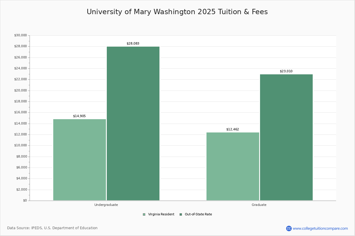 If you are a Virginia resident, the University of Mary Washington is a steal. Total tuition and mandatory fees for an in-state undergraduate for the 2025-26 year land around $15,882.